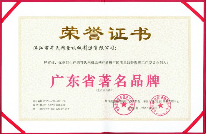2 2013年被授予“符氏米機(jī)系列產(chǎn)品被中國質(zhì)量監(jiān)督促進(jìn)工作委員會(huì)列入:廣東省著名品牌”榮譽(yù)證書